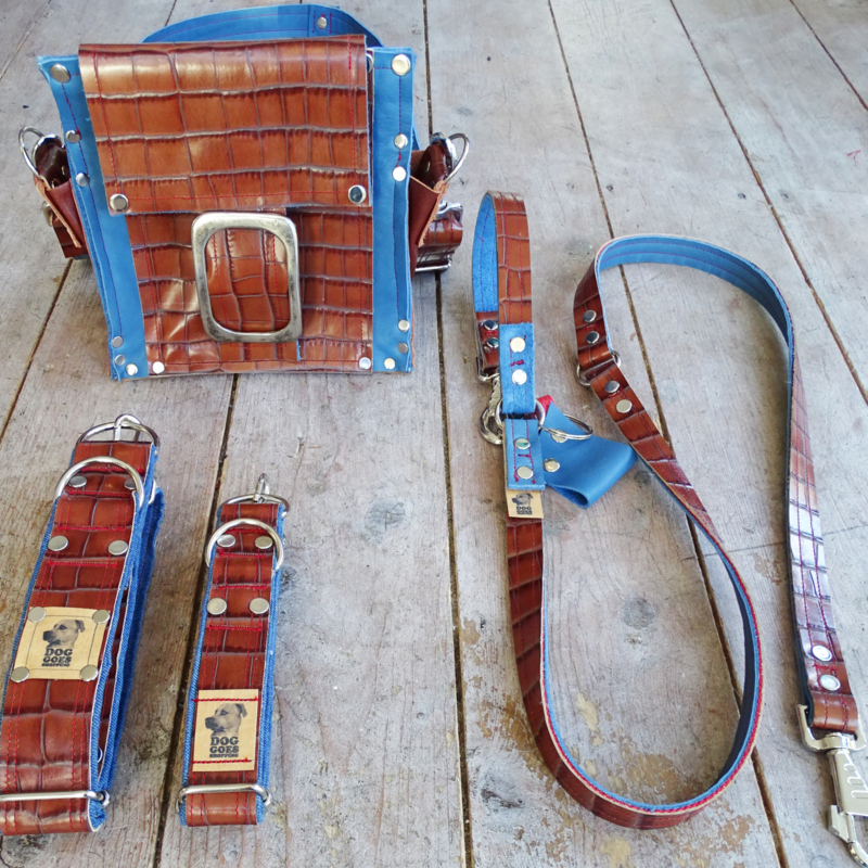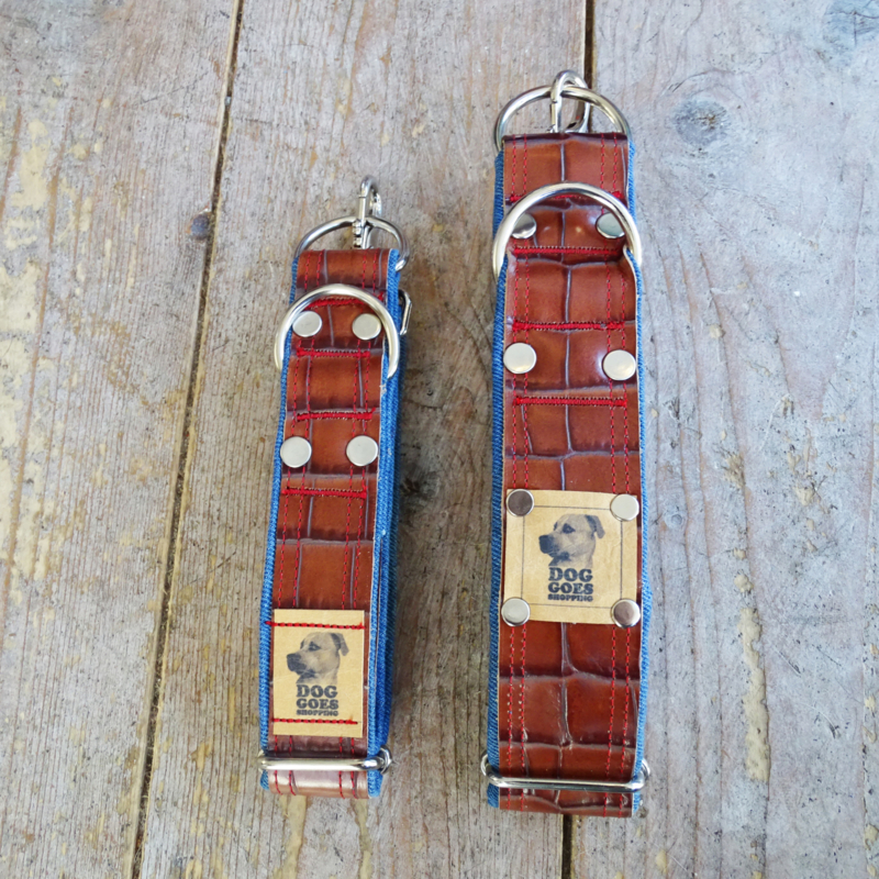 OverzichtDrie prachtige leren halsbanden met bruine print en denimblauw kleurig leer.
